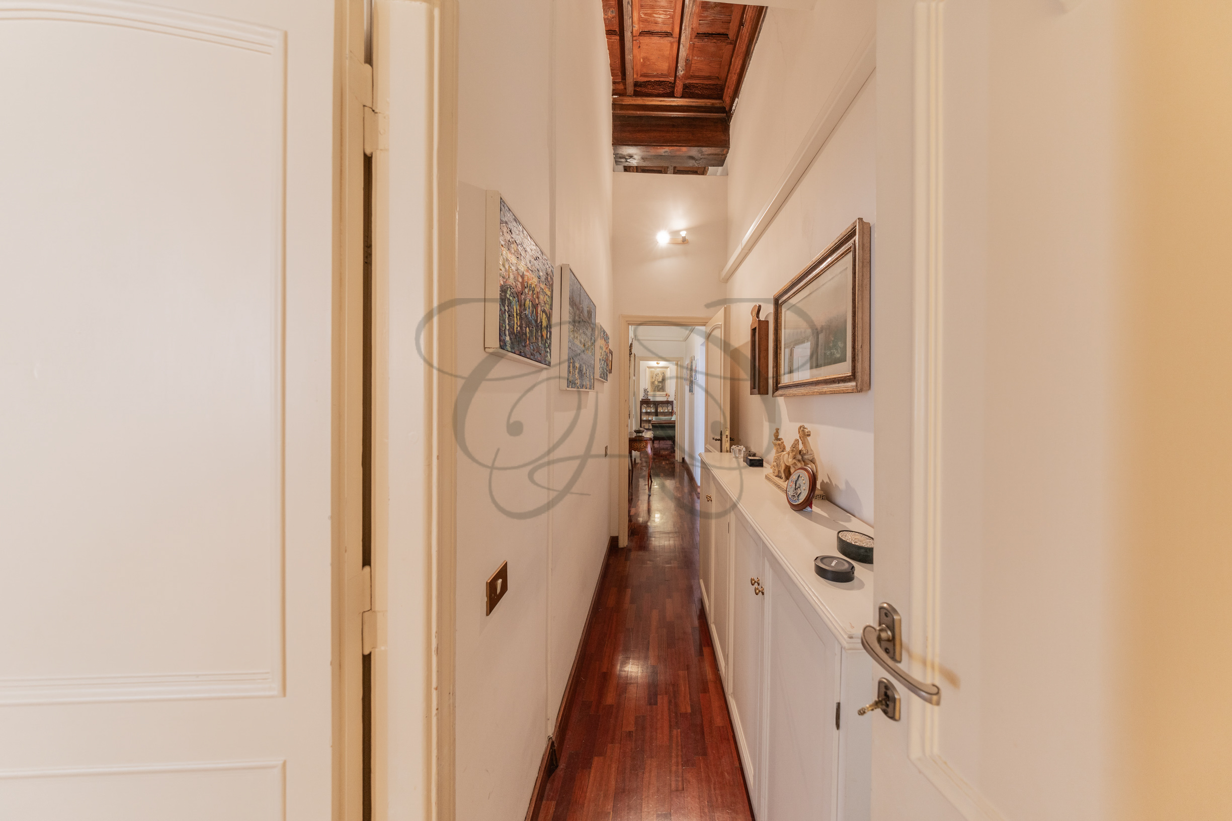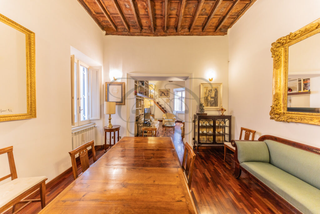 La cucina, adiacente e completa di ogni dotazione, supporta perfettamente sia le necessità quotidiane sia l’organizzazione di cene di rappresentanza. Le finiture di pregio, come il parquet e i soffitti a cassettoni, sottolineano il carattere della proprietà, nel perfetto stile delle dimore romane.