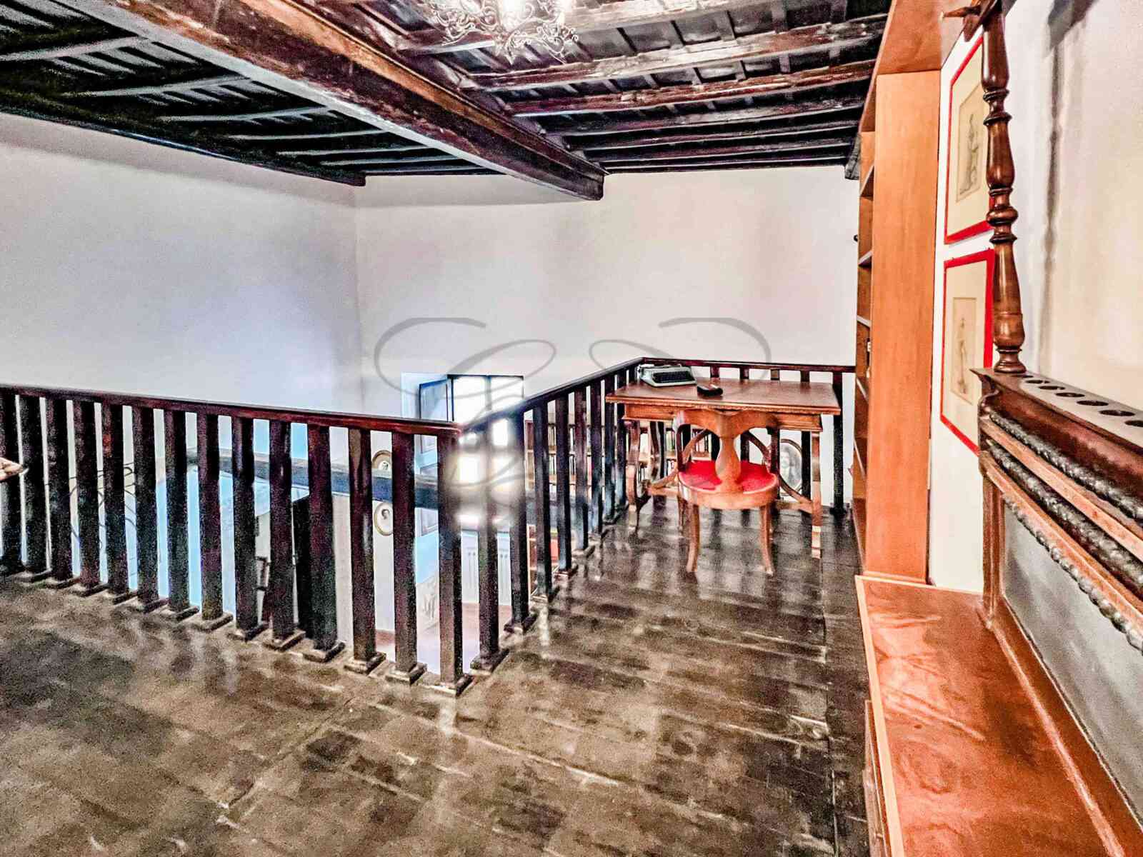 The second living room has a live-in mezzanine made of solid wood. A passageway environment that can be used as a private lounge, study, but above all a splendid library, where the high coffered ceilings and the third fireplace of the house invite to study and concentrate. It is also the ideal place to create a new space to personalize, such as a gym or the area dedicated to smart working.
