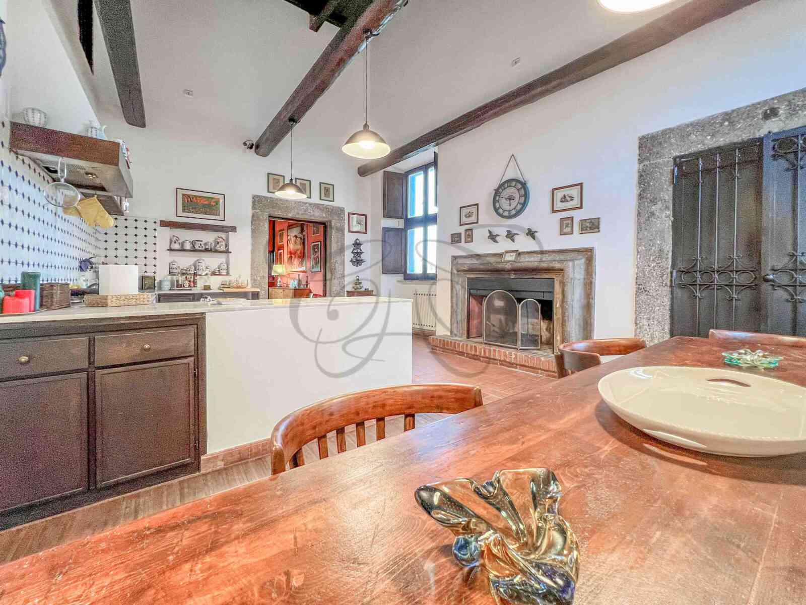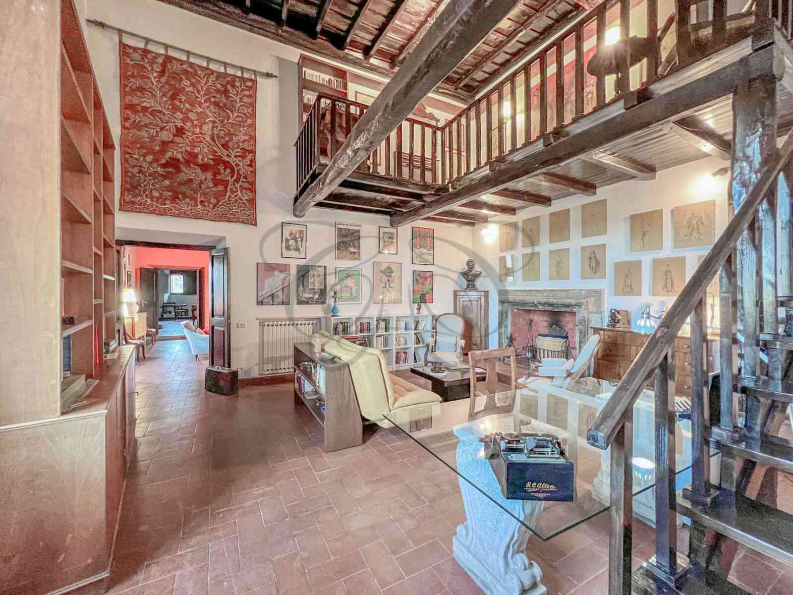 Following, the first large hall is the ideal space to receive many guests, in front of the ancient peperino fireplace. Here too, the ceilings reach six meters and the views are over the roofs of the historic center.