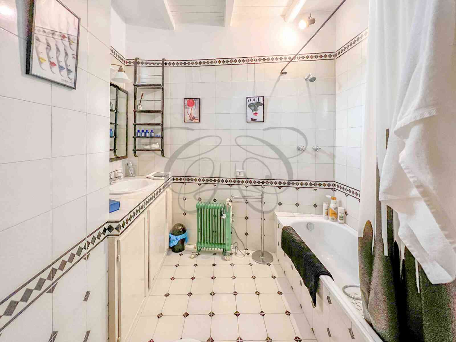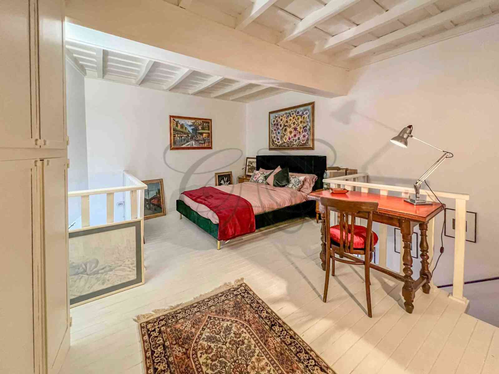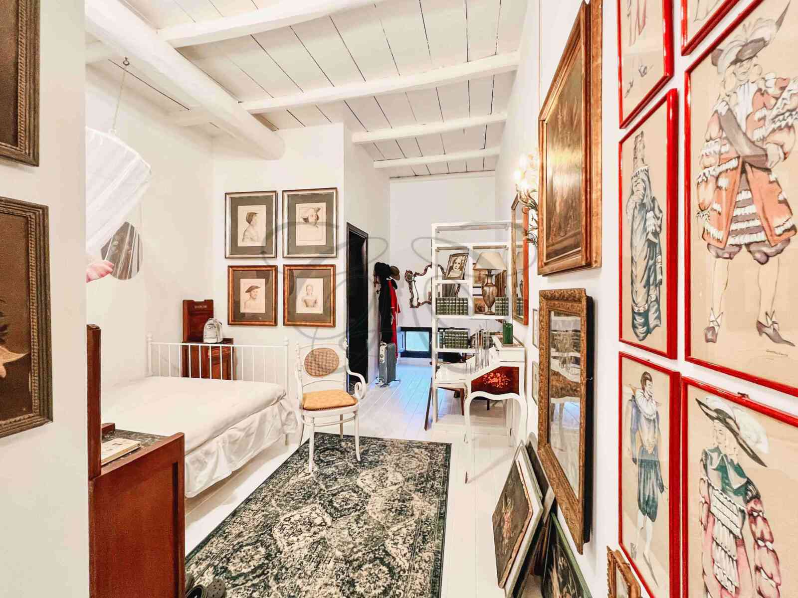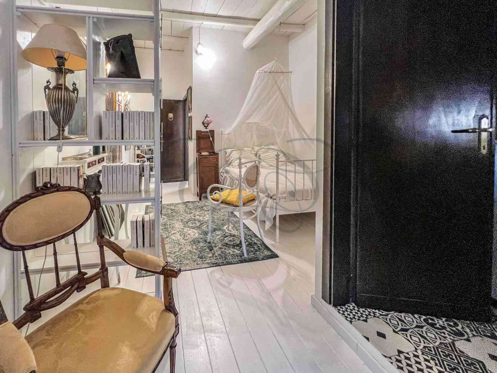 A second sleeping area occupies the upper volumes of the main entrance, at the level of the other mezzanines. Connected by a sophisticated wrought iron spiral staircase, it is composed of a bedroom with bathroom overlooking the main square.