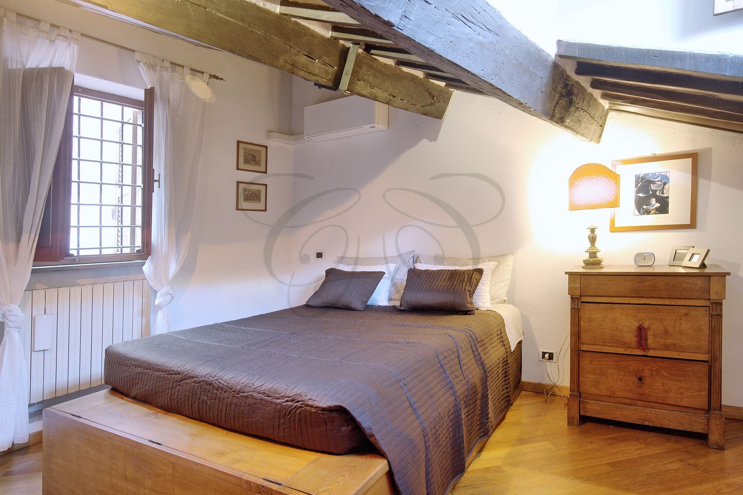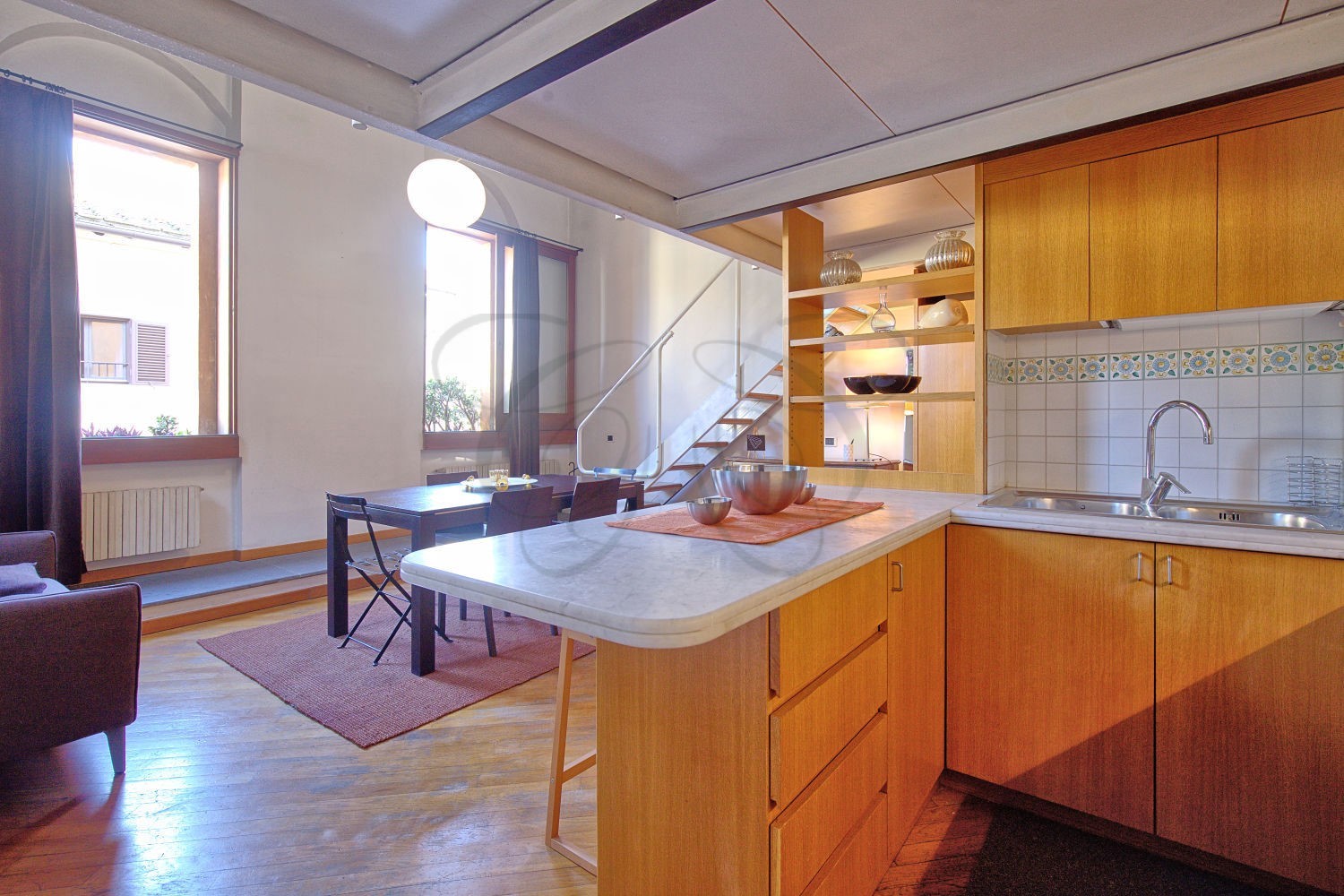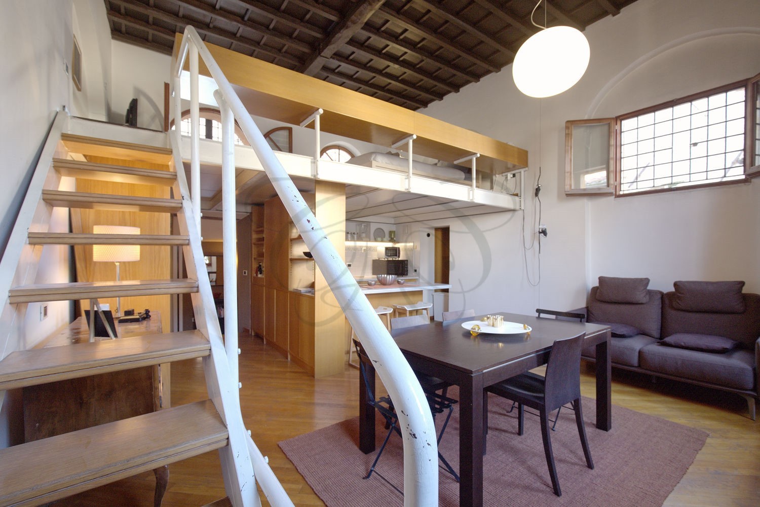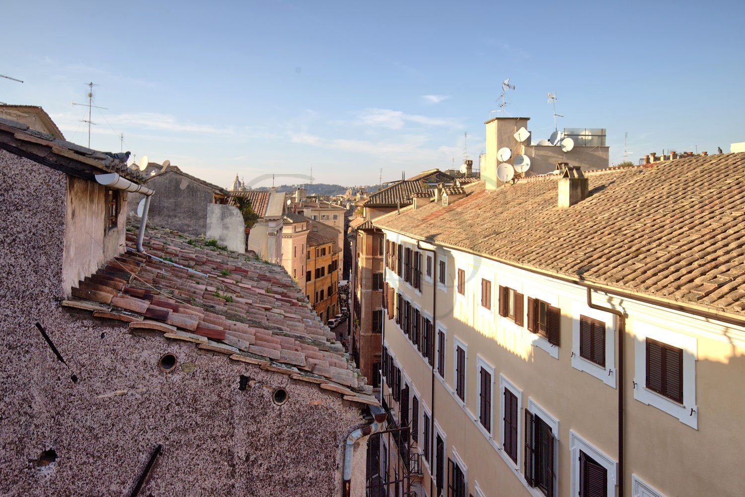 This two-level apartment with small terrace and panoramic altana is located in one of the most fascinating streets of Renaissance Rome.