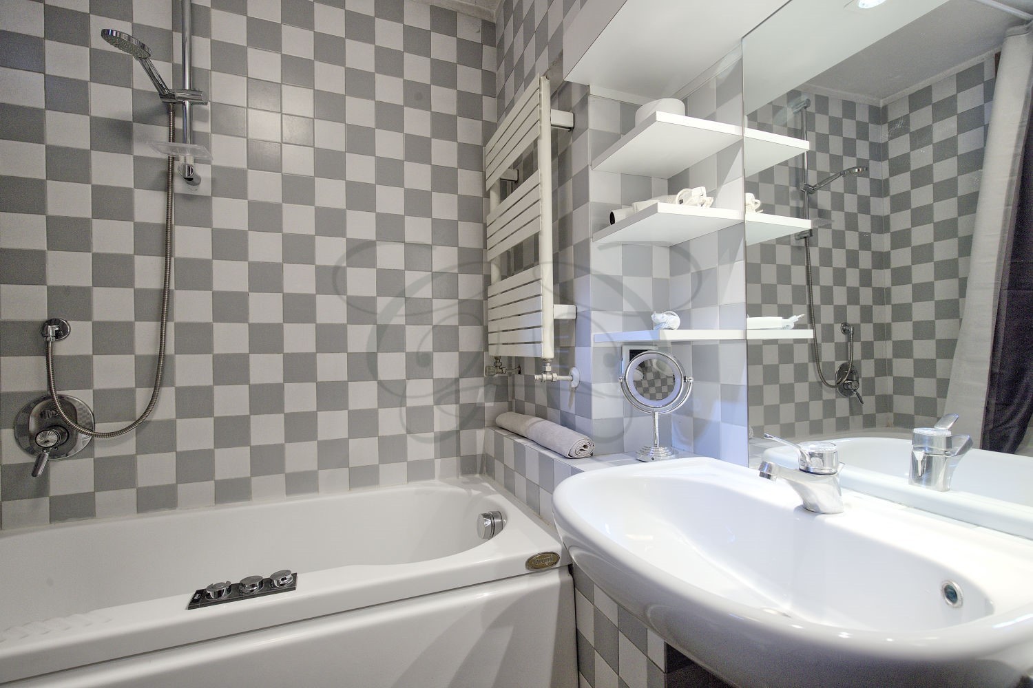 Tower for Rent Rome Italy, a luxury estate on the fourth and fifth floor of a historic building in via di Monserrato without elevator. On the first level, the apartment consists of a large living room with open kitchen with peninsula, dining area and bathroom with Jacuzzi.
