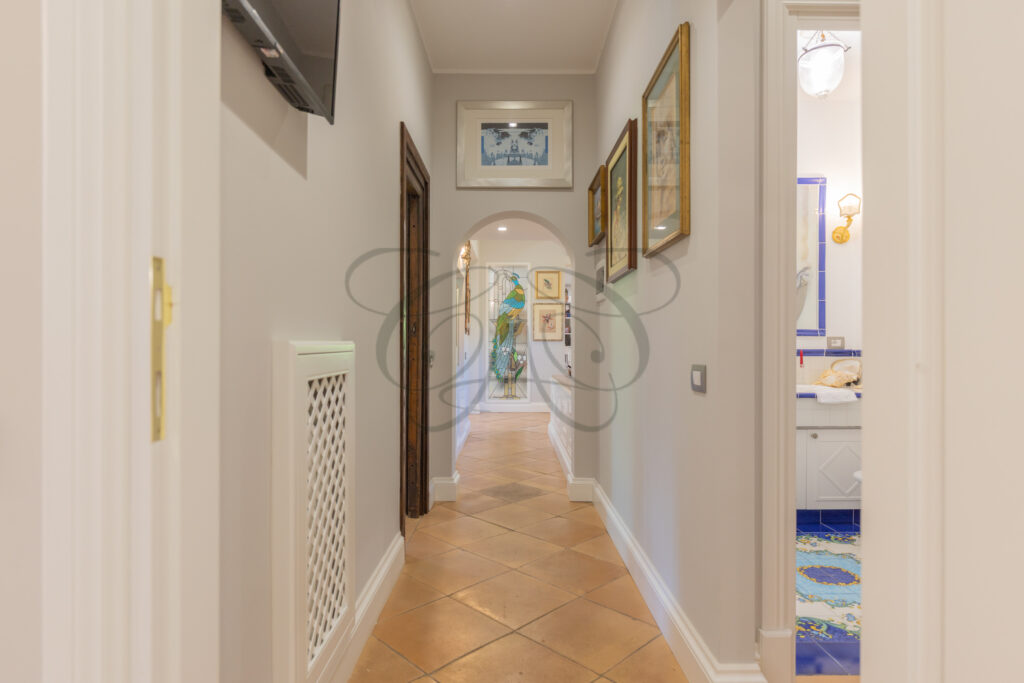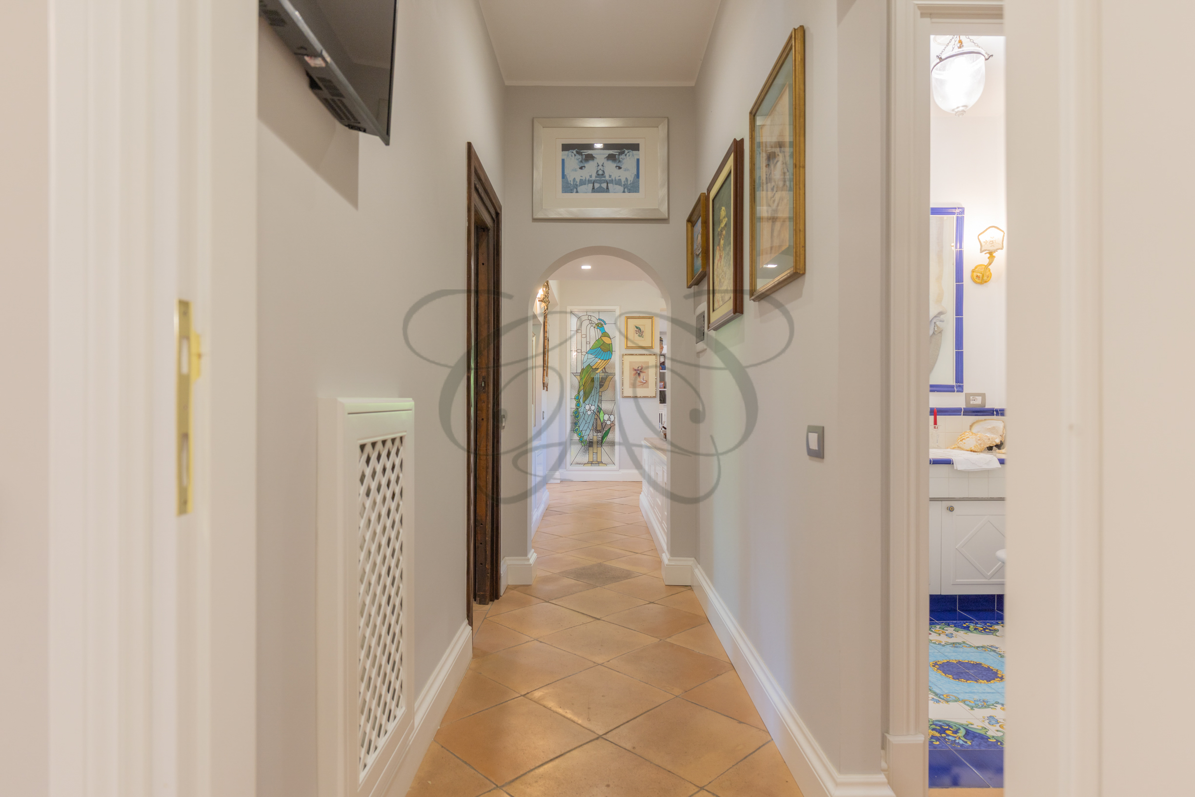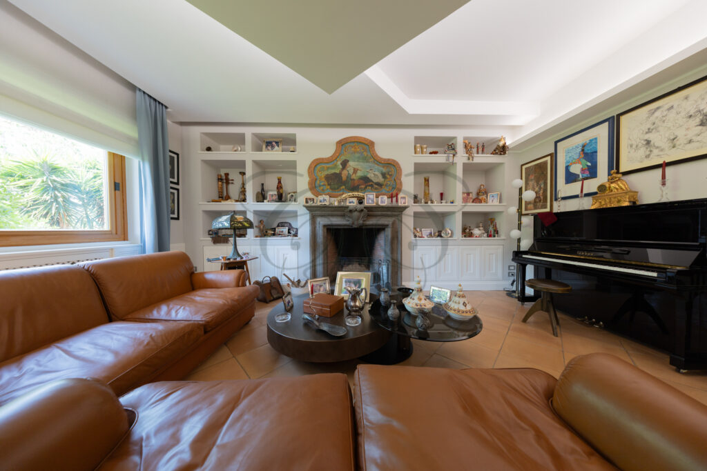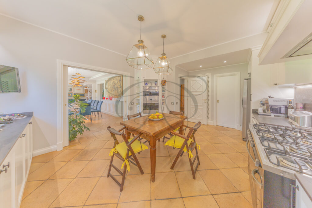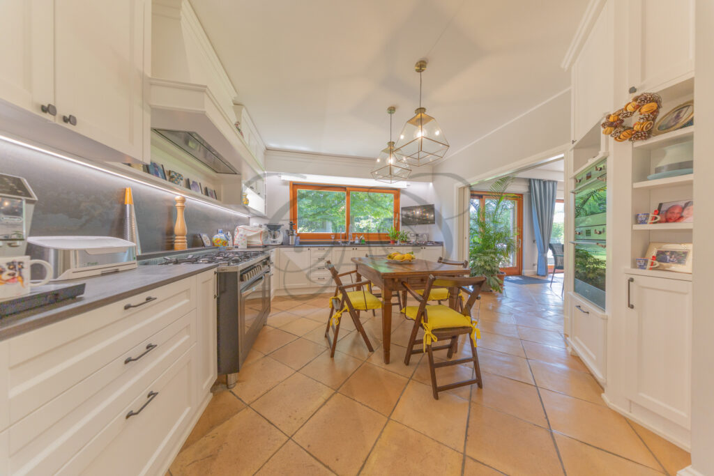 The principal floor is entirely dedicated to sophisticated entertaining. An entrance hall opens into an expansive double reception room, enhanced by a classic Peperino stone fireplace. The layout flows seamlessly into a large dining room, perfect for hosting numerous guests, and a spacious, fully equipped eat-in kitchen.