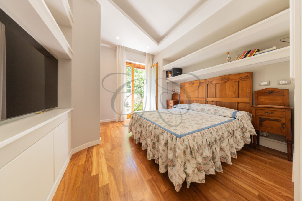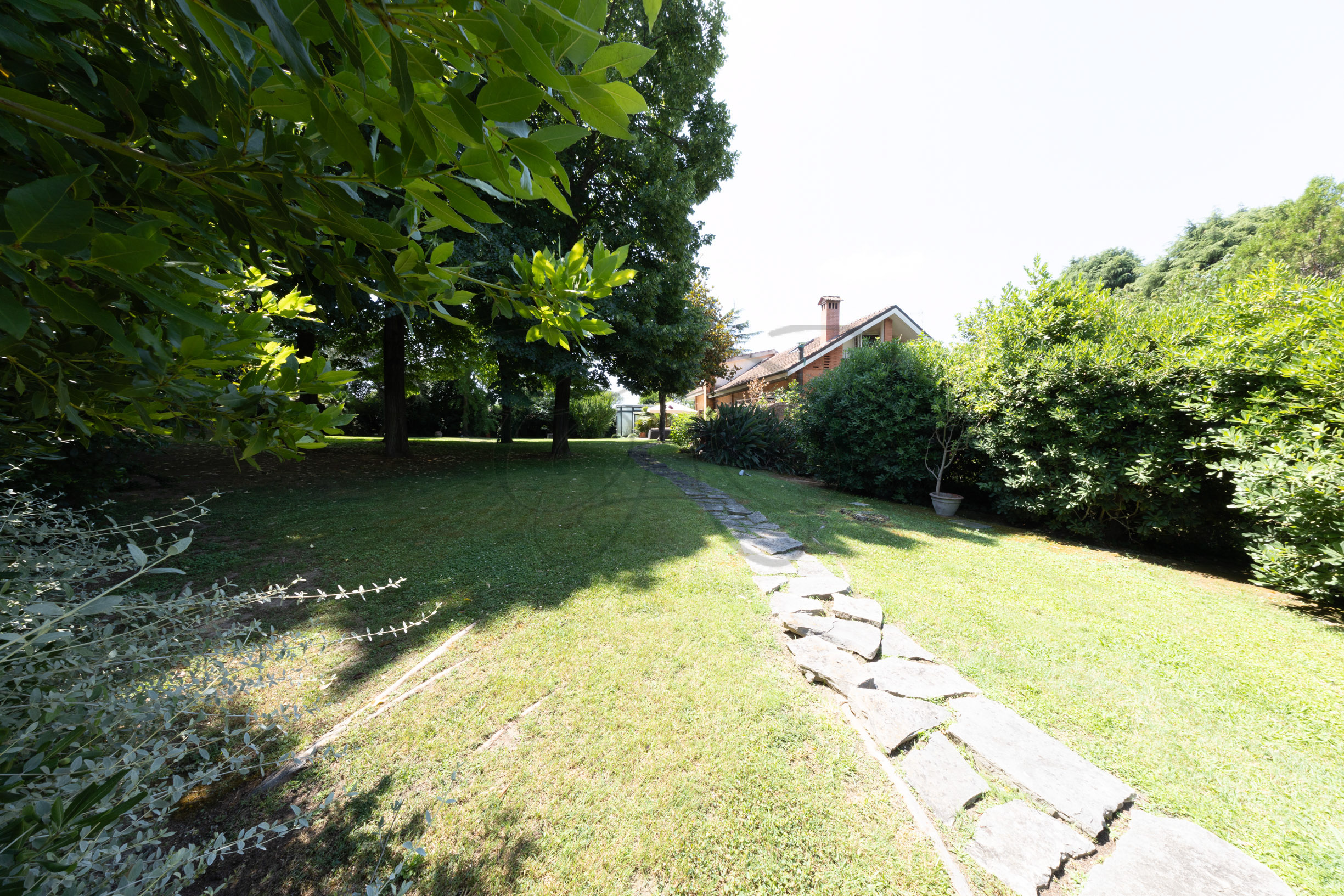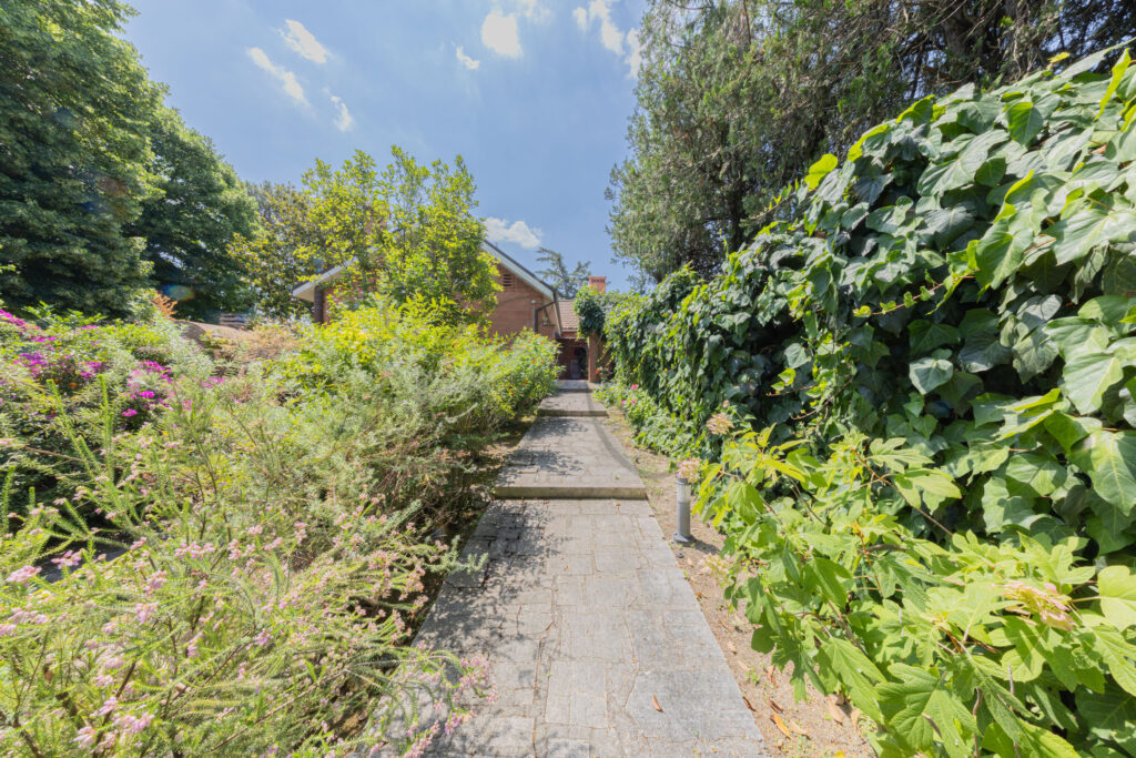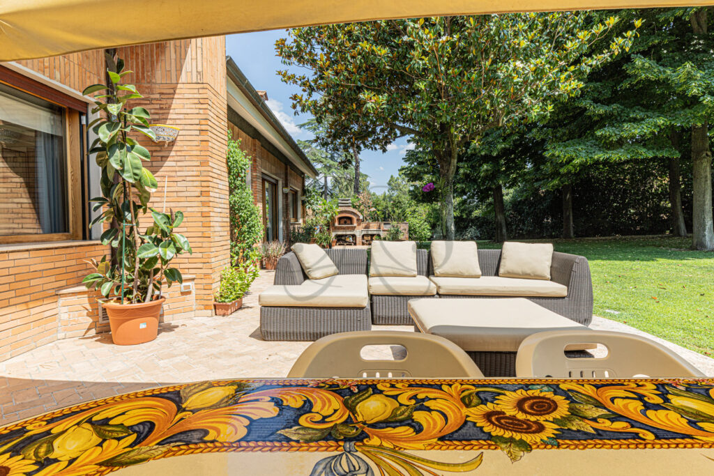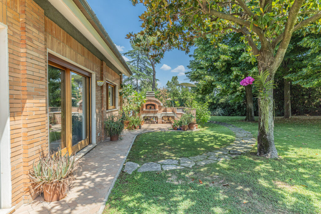 The private garden is a haven of peace. A beautiful flat lawn is framed by mature hedges and tall trees, ensuring absolute privacy. The portico, a natural extension of the living area, is equipped with a large masonry barbecue kitchen, making it the perfect setting for al fresco dining.