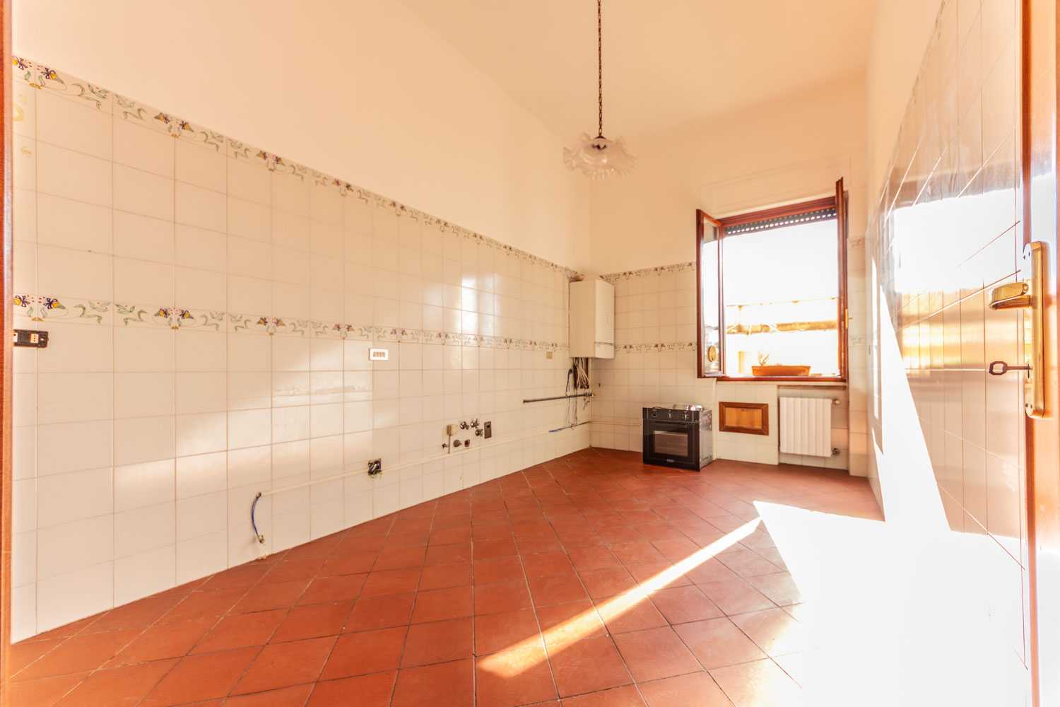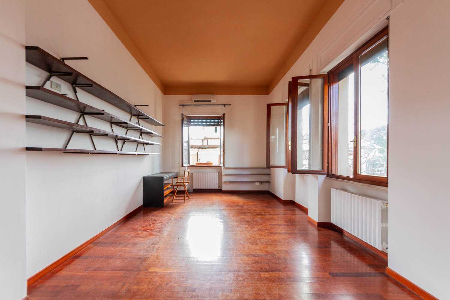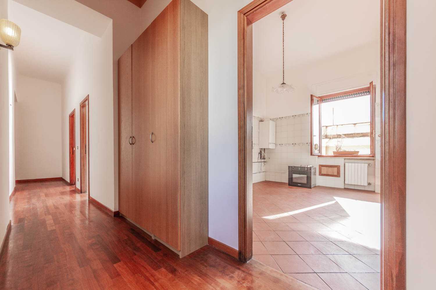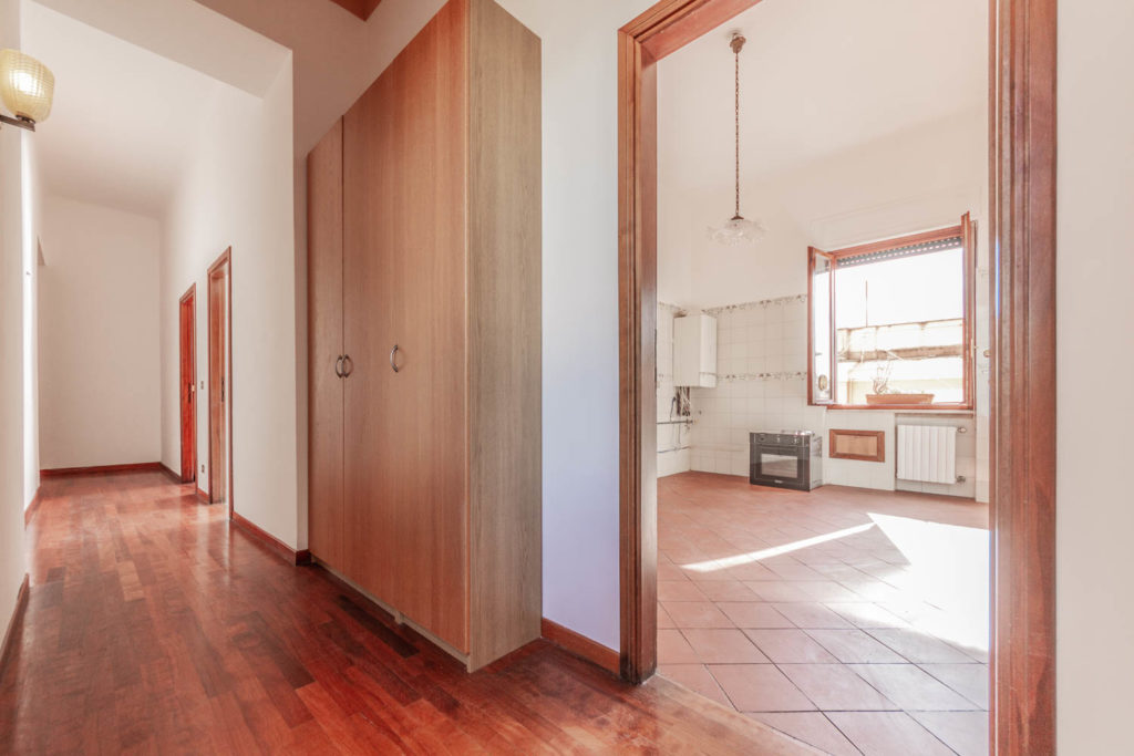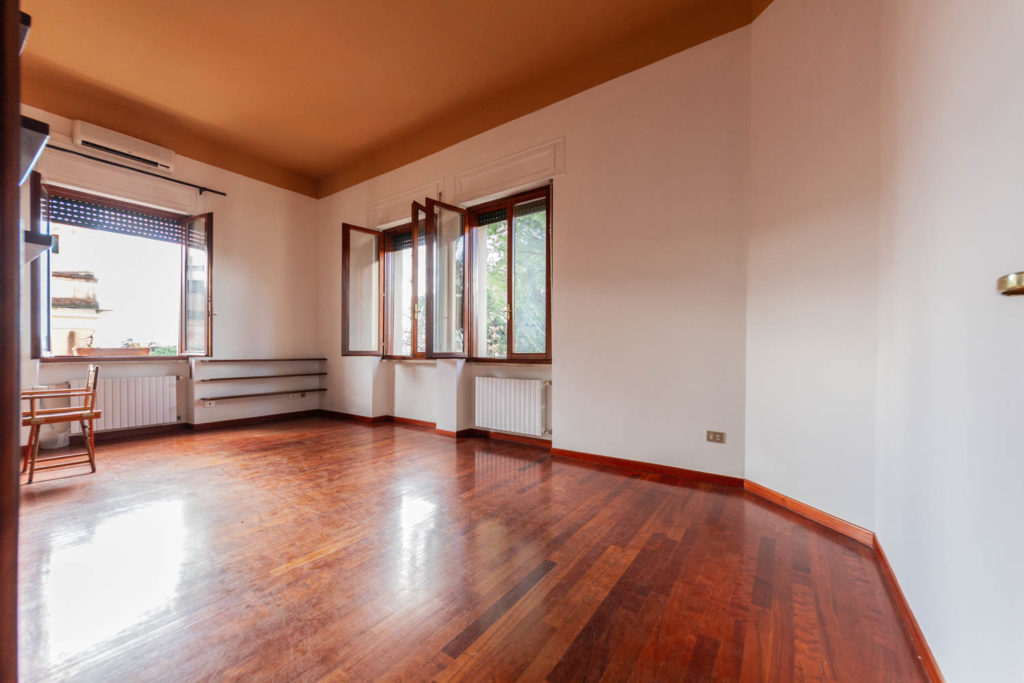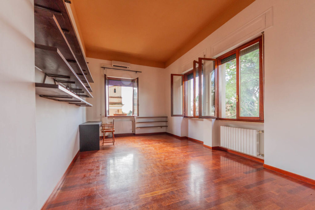 Il salone è arioso e soleggiato, grazie alle tre grandi finestre con affacci liberi e dominanti. Le viste sono sugli alberi di Villa Sciarra. La cucina abitabile con finestra è ampia ma non arredata.