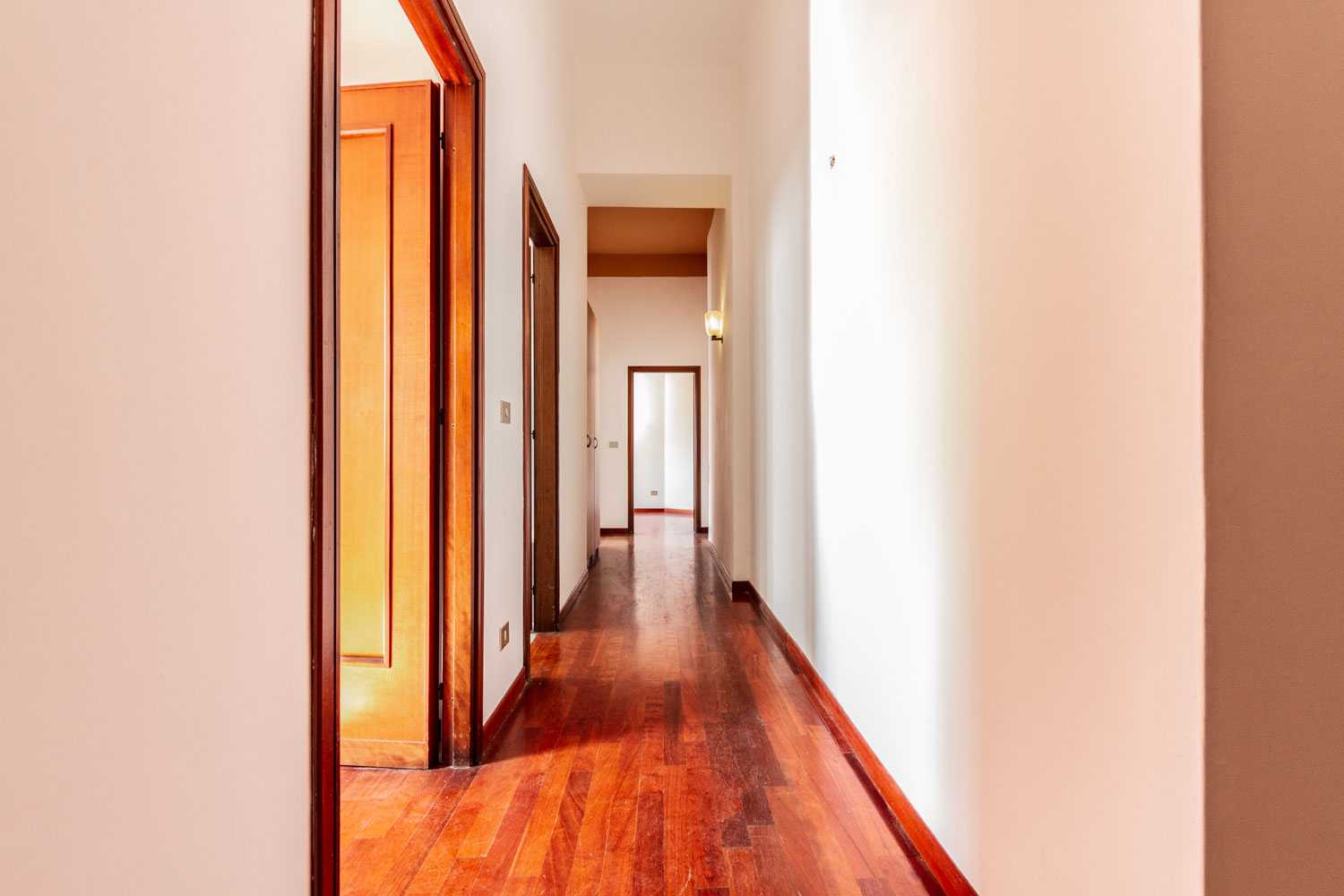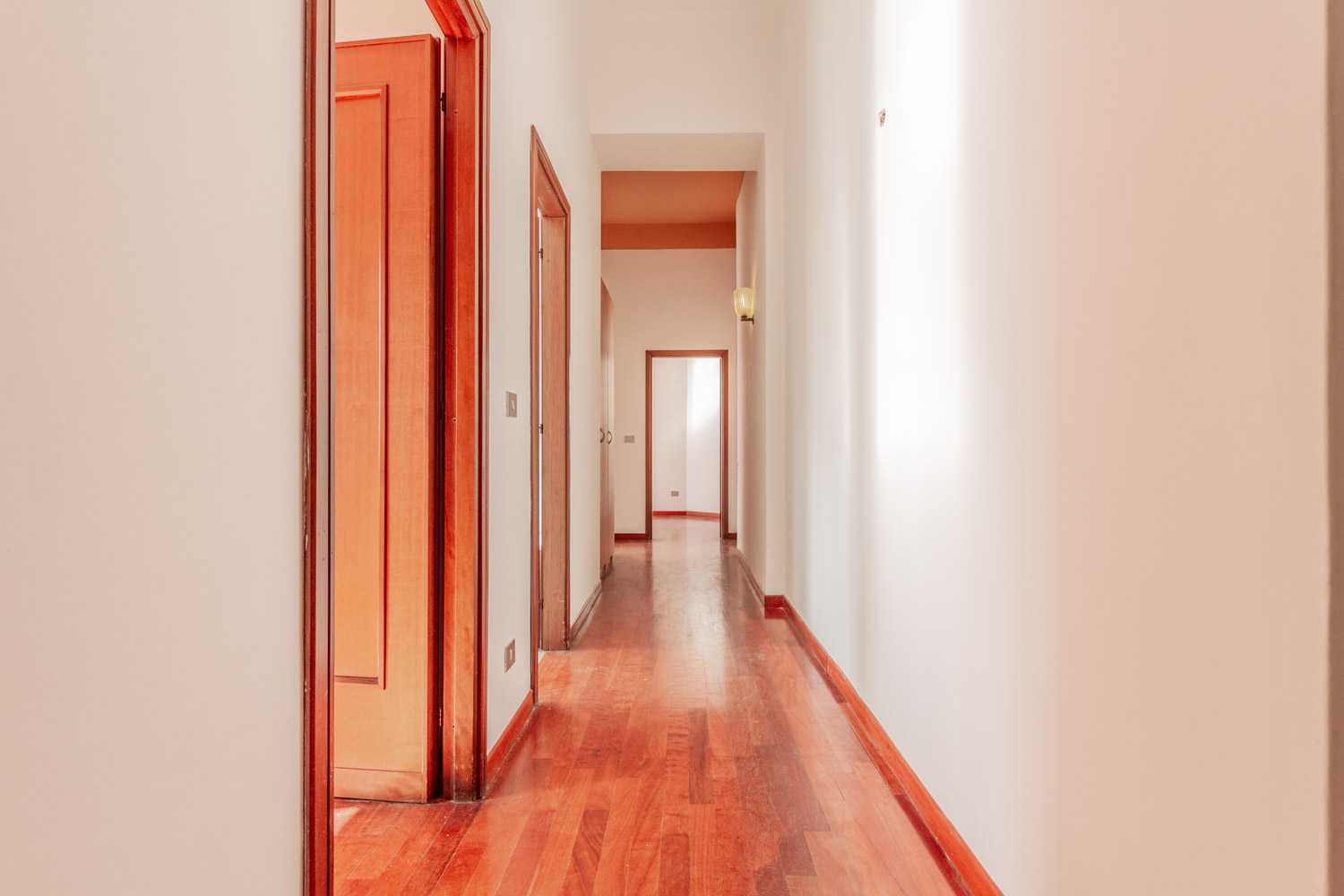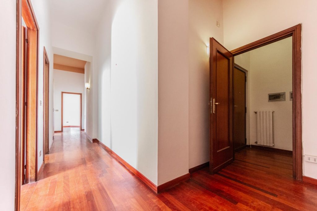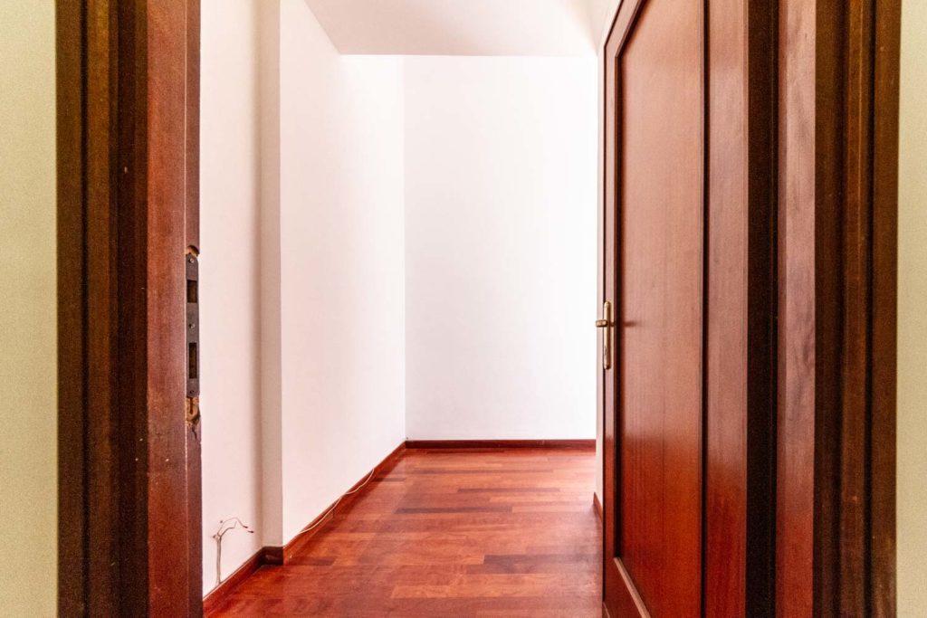 Con una metratura di circa 72 mq interni, ha una disposizione lineare degli ambienti seguendo una pianta rettangolare. L’ascensore arriva al piano e si è accolti dall’ingresso da cui parte il corridoio lungo il quale si affacciano tutti gli ambienti della casa.
