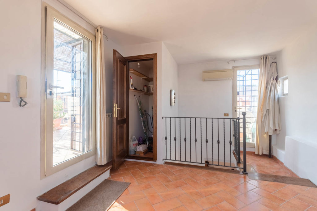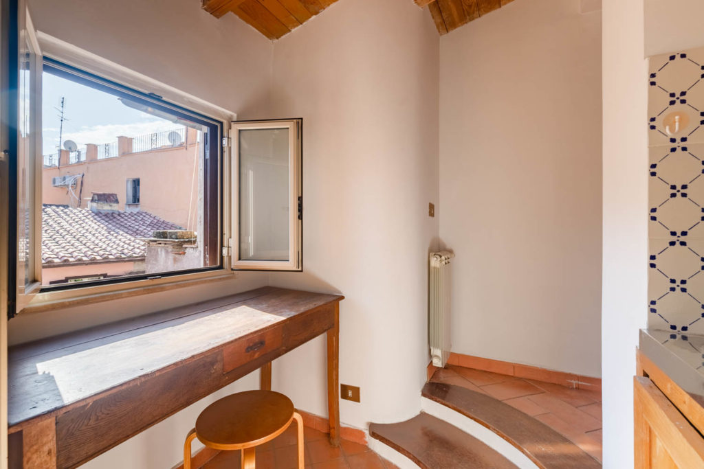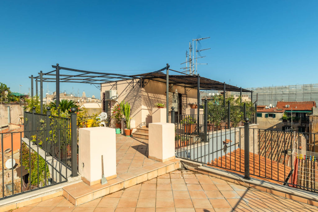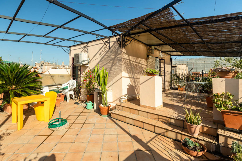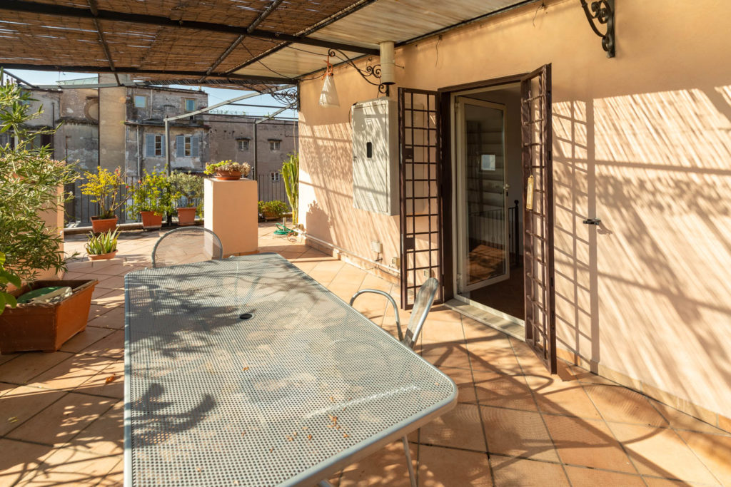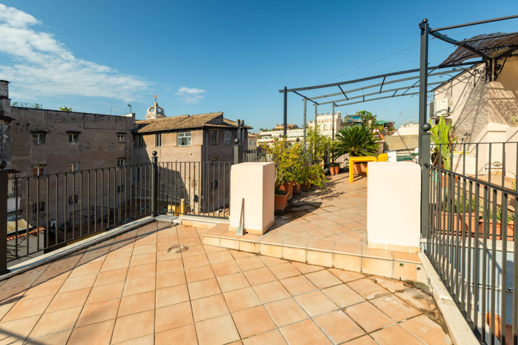 Affitto Roma Campo dei Fiori, appartamento di 125 metri quadri con terrazzo di 50 metri quadri all’ultimo piano di un palazzo ottocentesco senza ascensore. La proprietà si trova adiacente al celebre mercato di Campo de’ Fiori e alle meraviglie architettoniche di Via Giulia.