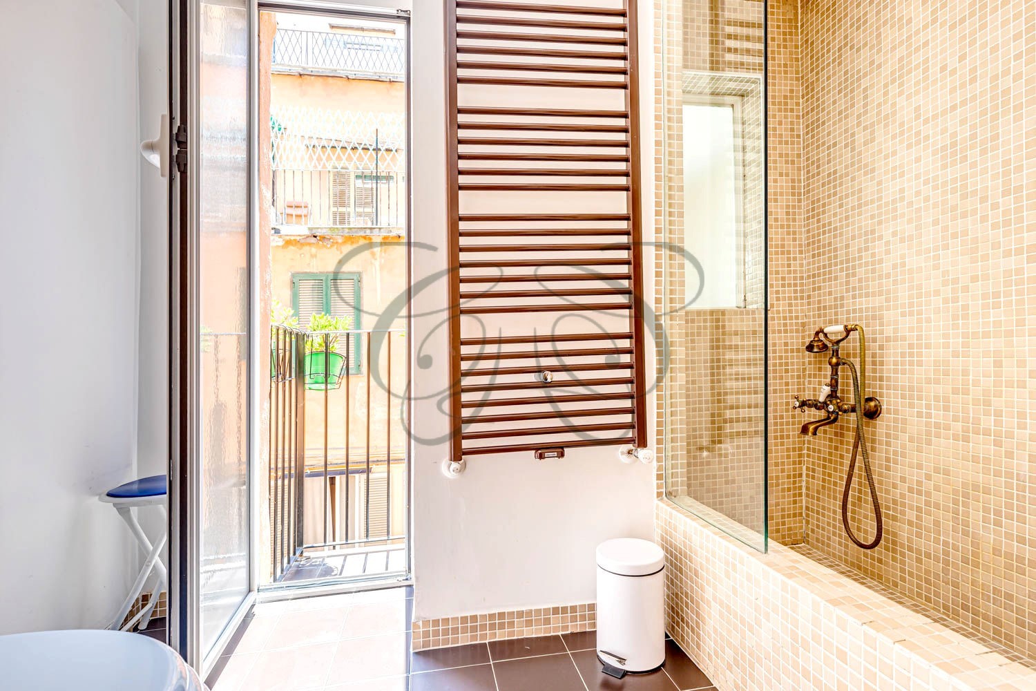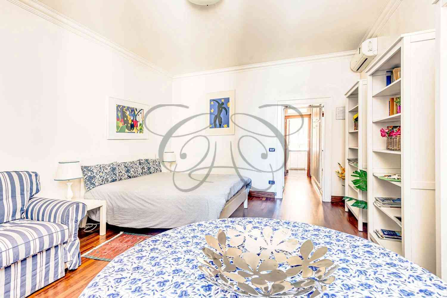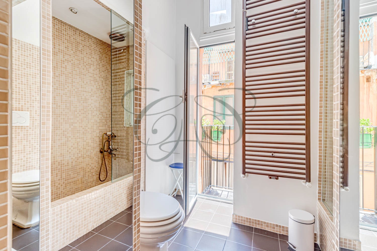 L’ampia camera, con pavimenti in parquet e arredi moderni, offre una bella vista su tutta via di Bocca di Leone ed è dotata di molti spazi di contenimento. Accanto all’ingresso, la cucina con finestra non è abitabile, ma è perfettamente equipaggiata e pratica. Troviamo poi un bagno con mosaici, dotato di vasca collegato ad un delizioso balcone.