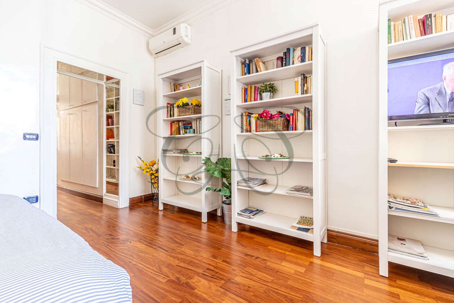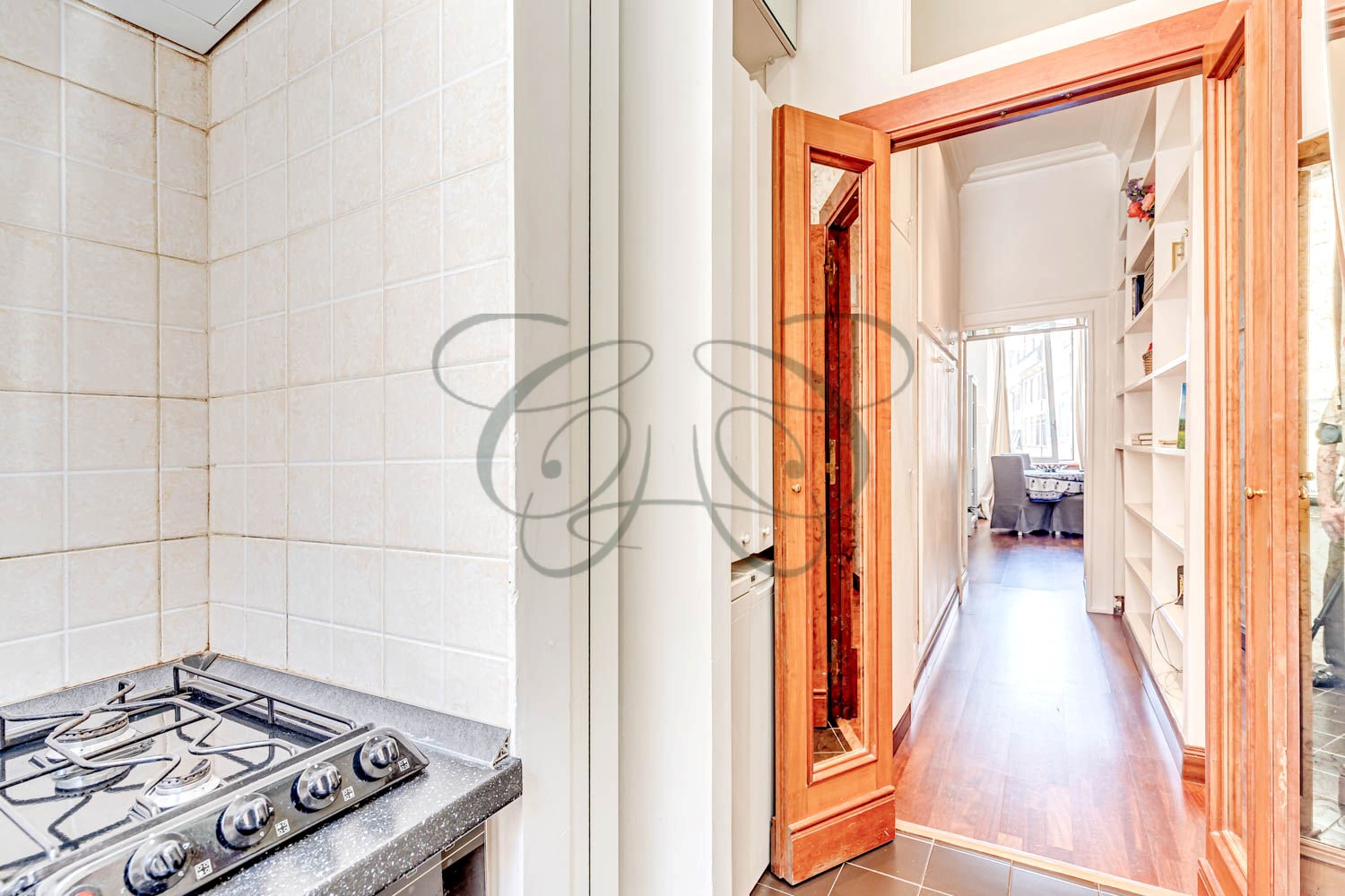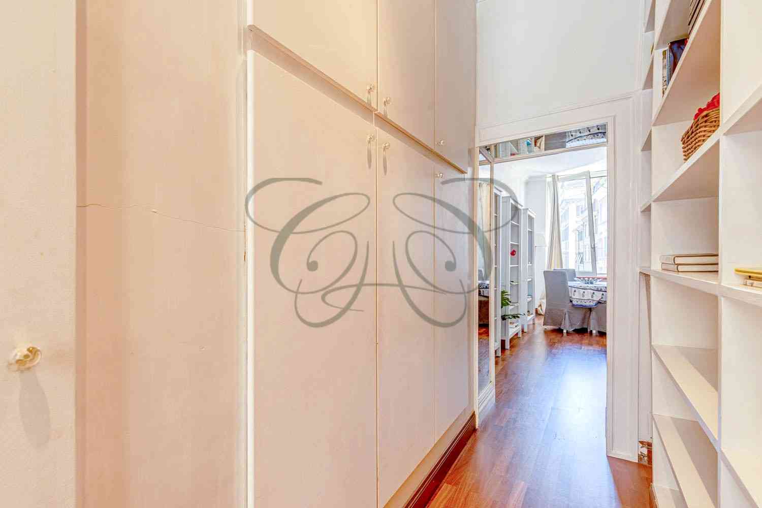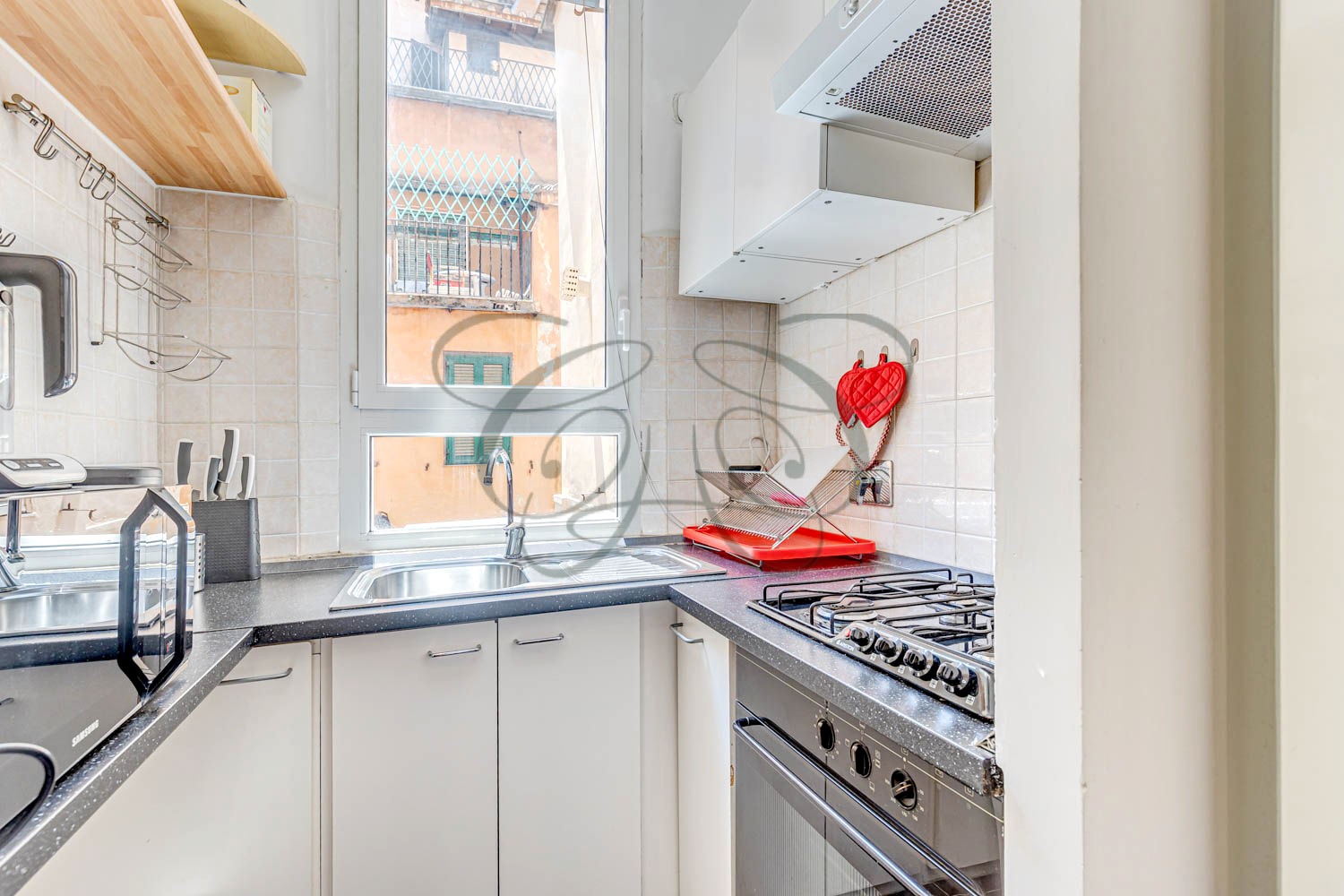 L’ampia camera, con pavimenti in parquet e arredi moderni, offre una bella vista su tutta via di Bocca di Leone ed è dotata di molti spazi di contenimento. Accanto all’ingresso, la cucina con finestra non è abitabile, ma è perfettamente equipaggiata e pratica. Troviamo poi un bagno con mosaici, dotato di vasca collegato ad un delizioso balcone.
