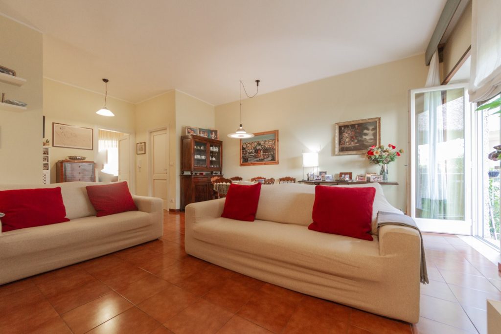 Disposta su due livelli, il piano terra dispone di un ampio soggiorno e di una cucina perfettamente attrezzata. Da entrambi è possibile uscire nello spazio esterno esclusivo, costituito da un terrazzo coperto per pranzi e cene con tutta la famiglia, che prosegue nel giardino a prato bordato di siepi.