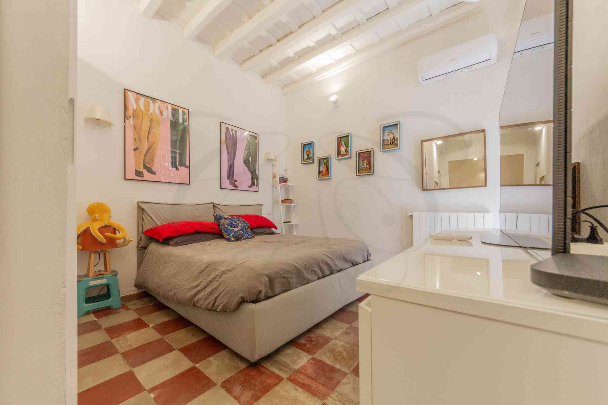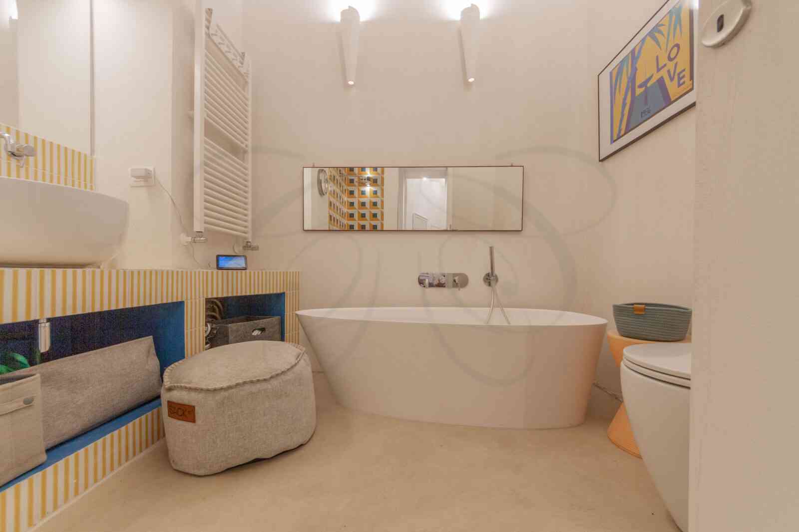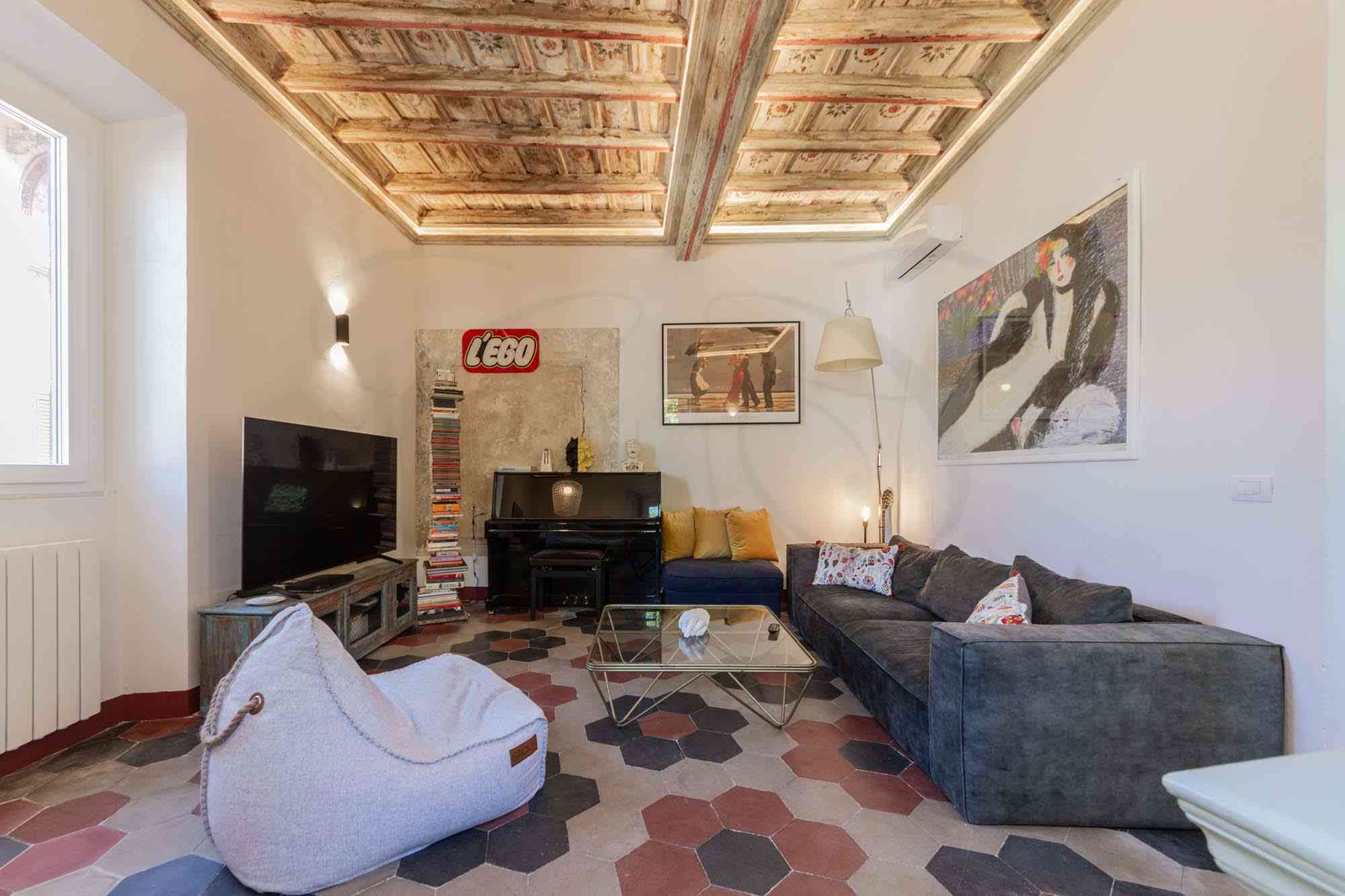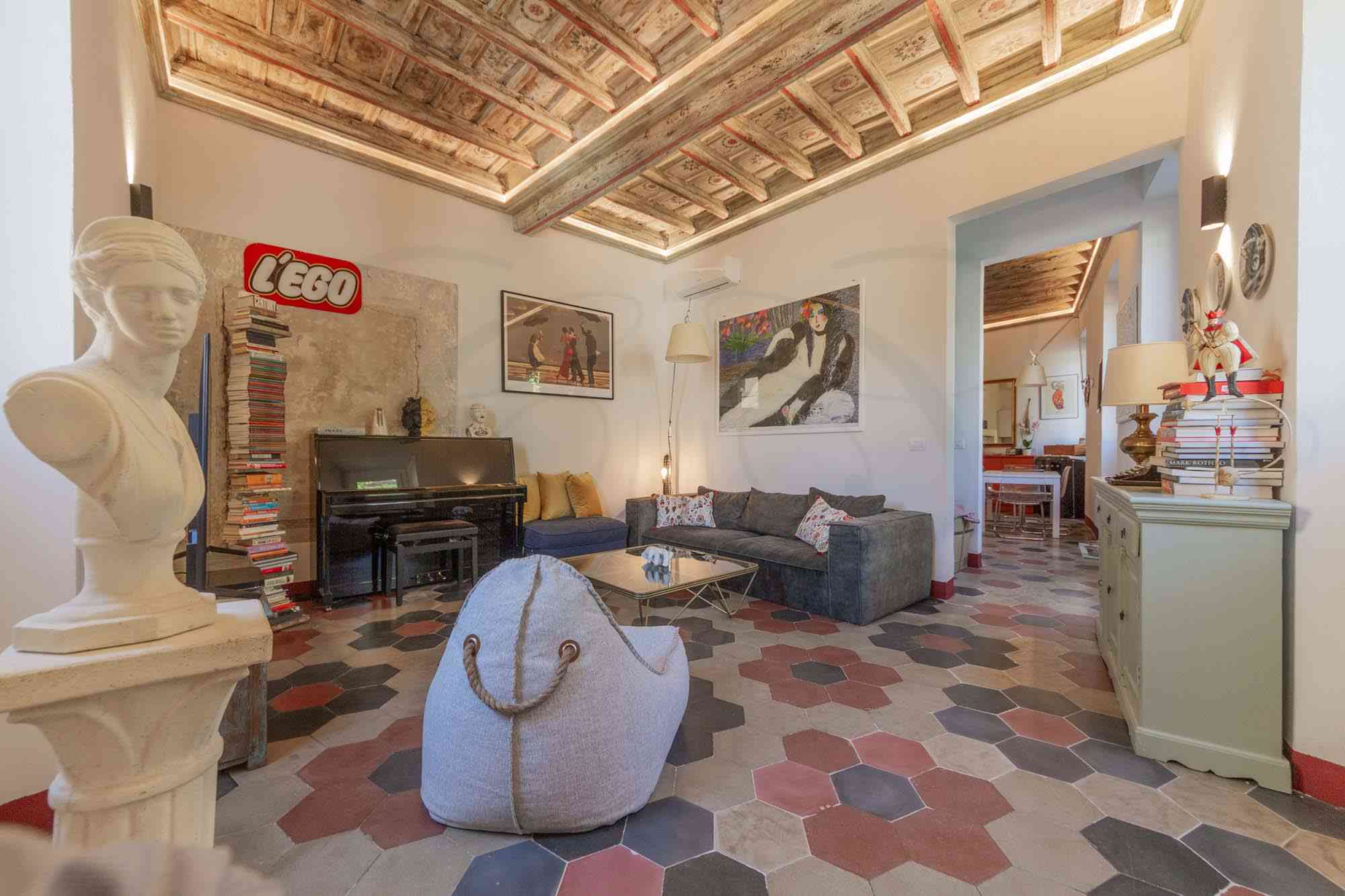 Disposto su 105 mq, l’appartamento a Trastevere si sviluppa lungo una planimetria articolata e divertente, tipiche di questi palazzi un cui, nel corso dei secoli, le unità immobiliari hanno variato la propria disposizione.