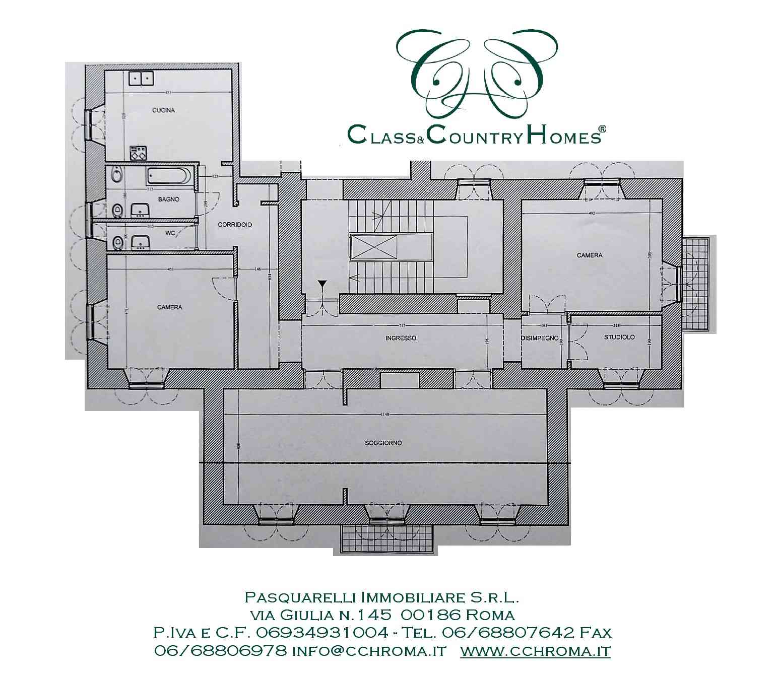 La planimetria regolare definisce ambienti ampi e ariosi, con particolare attenzione alla zona di rappresentanza. Così, superato l’ampio ingresso si accede al vasto living con balcone, costituito da un salone doppio e dalla sala da pranzo, fregiata di un affresco dell’epoca, perfettamente conservato. Troviamo poi la cucina abitabile completamente arredata e i due bagni della casa, appena rimessi a nuovo.